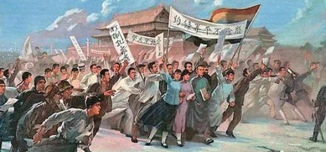 ▲1919年,五四运动,北京示威游行的学生队伍向天安门进发,揭露卖国贼在巴黎和会出卖中国主权,要求北京政府拒签巴黎和约、废除二十一条、抵制日货等。