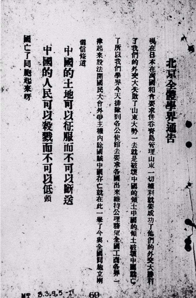 ▲五四运动期间,北京大学学生游行时散发的《北京全体学界通告》,其中明确提到了“外争主权,内除国贼”的口号。