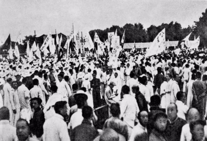 ▲五四运动期间,上海各界两万余人得知北京学生被捕的消息后,在南市公共体育场召开国民大会,声援学生游行。