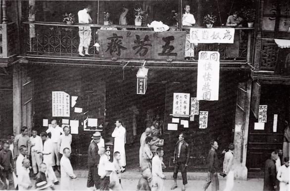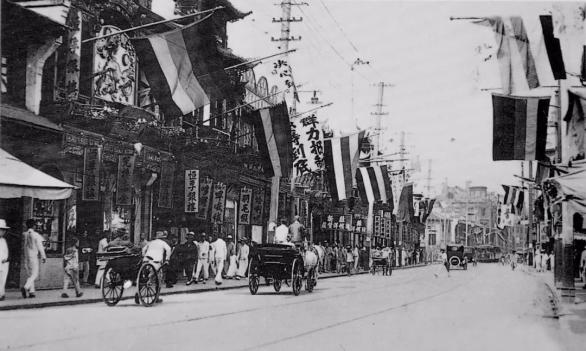 ▲五四运动期间,上海南京路街头高悬布旗“群力抑制、坚持到底”。