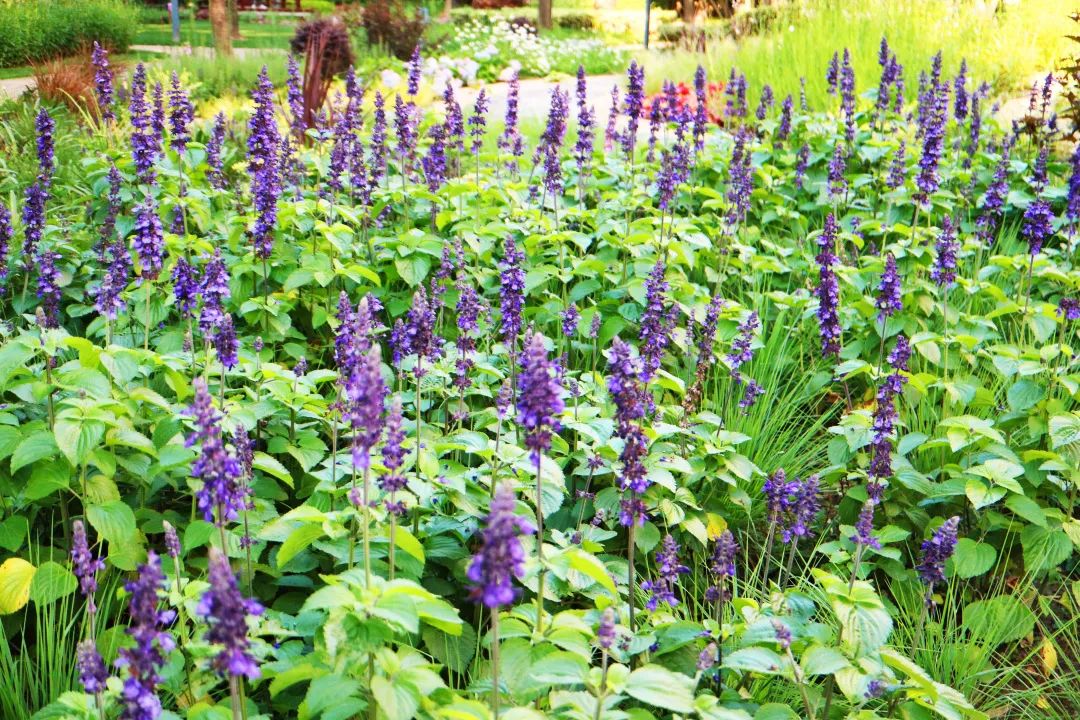 “流水飘香”中心区域用黄米石勾勒出一条蜿蜒的流水主景,配合香氛鼠尾草系列(天蓝鼠尾草、林荫鼠尾草、蓝霸鼠尾草、新篇章鼠尾草)、毛冠草、当微风轻轻吹来,这一簇簇如梦如诗的蓝色、紫色小花摇曳在“流水”旁,风景独好 。