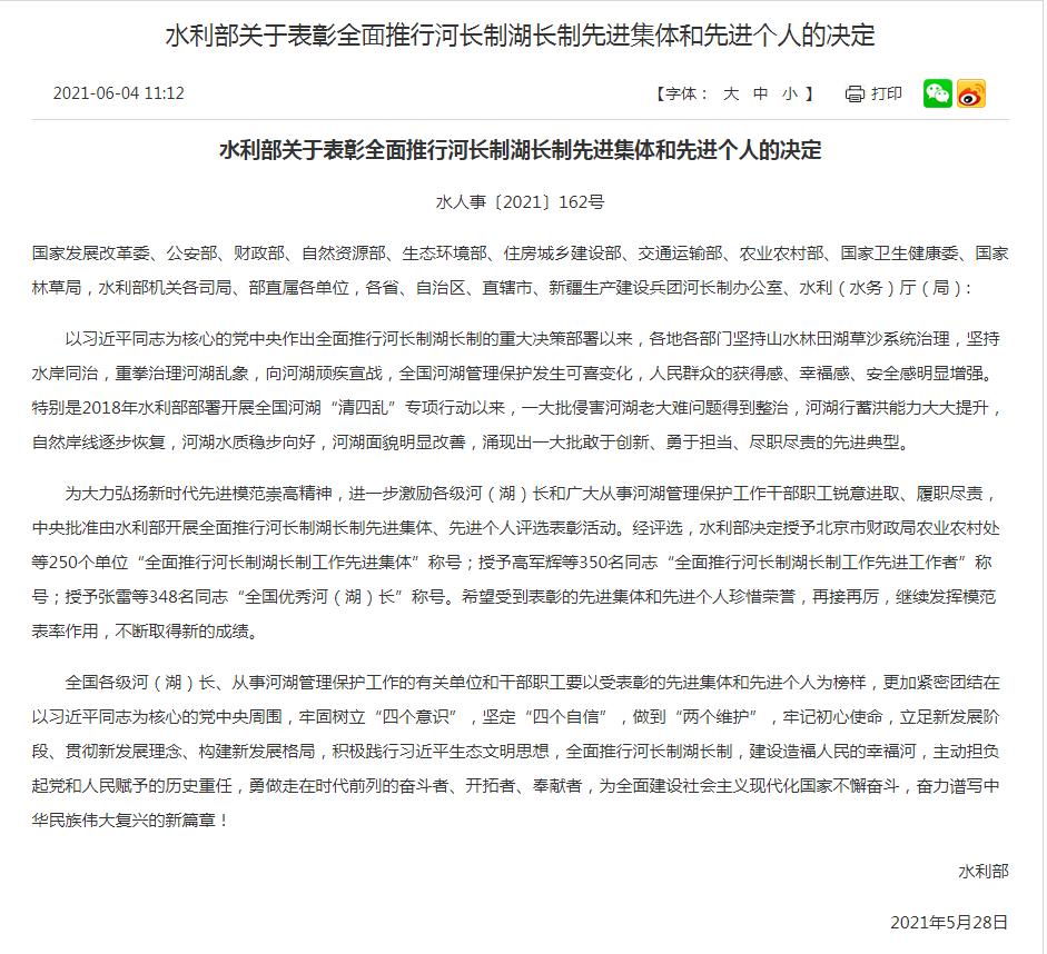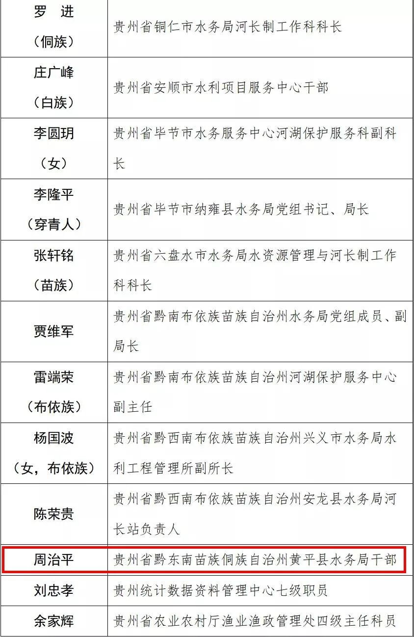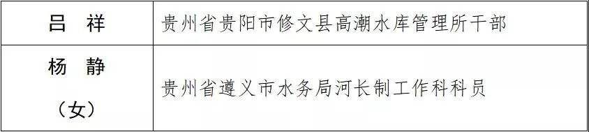 为大力弘扬新时代先进模范崇高精神,进一步激励各级河(湖)长和广大从事河湖管理保护工作干部职工锐意进取、履职尽责,经中央批准,水利部组织评选表彰一批全面推行河长制湖长制先进集体和先进个人。经过逐级推荐、层层审核,全国共评选出250个“全面推行河长制湖长制工作先进集体”、350名同志“全面推行河长制湖长制工作先进工作者”、348名同志“全国优秀河(湖)长”称号。贵州省付凯等13名同志荣获“优秀河(湖)长”,贵州省生态环境厅水生态环境处等9个单位荣获“全面推行河长制湖长制工作先进集体”,吕祥等16名同志荣获“全面推行河长制湖长制工作先进工作者”。