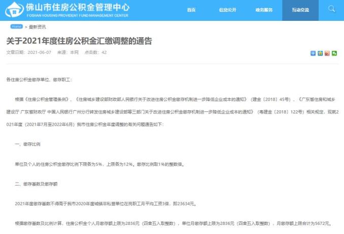 6月7日,佛山市住房公积金管理中心网站发布《关于2021年度住房公积金汇缴调整的通告》。通告显示,2021年度住房公积金缴存基数调整为23634元,个人及单位合计月缴存额上限调整为5672元。