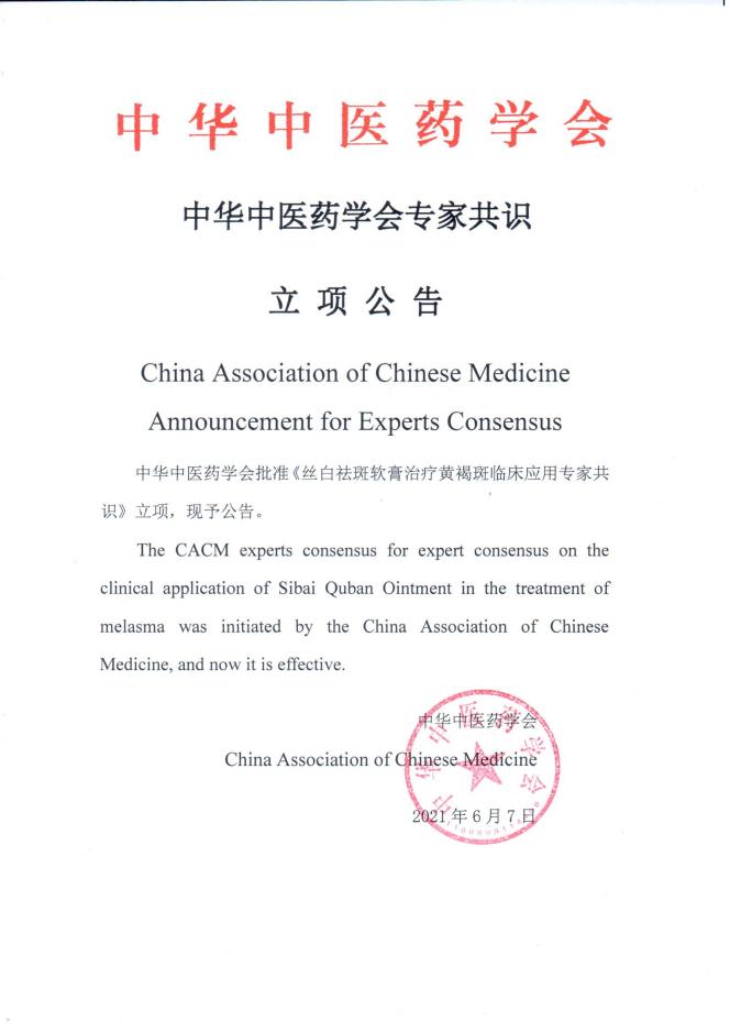 《丝白祛斑软膏治疗黄褐斑临床应用专家共识》简介黄褐斑是一种面部局限性对称性淡褐色色素沉着的皮肤病,多见于中青年女性,易诊难治,容易反复。丝白祛斑软膏(国药准字B20020420)于2002年获批上市,来源于浙江中医学院发掘的民间验方,以中医外治祛风活血、化瘀莹肌为治则,具有活血化瘀、祛风消斑的功效,适用于气血瘀滞,肌肤失养所致的黄褐斑,是2019年《黄褐斑中医治疗专家共识》推荐用药。丝白祛斑软膏上市近20年,积累了大量的临床研究数据和应用经验,但尚未形成指导性文件。本项目在系统梳理已有研究成果的基础上,结合循证医学证据,邀请来自全国皮肤科领域的临床一线专家,共同研讨论证丝白祛斑软膏临床治疗黄褐斑的用法用量、疗程、联合用药、安全性等问题,旨在提高临床疗效,促进合理用药,减少用药风险。(此部分内容由项目组提供)