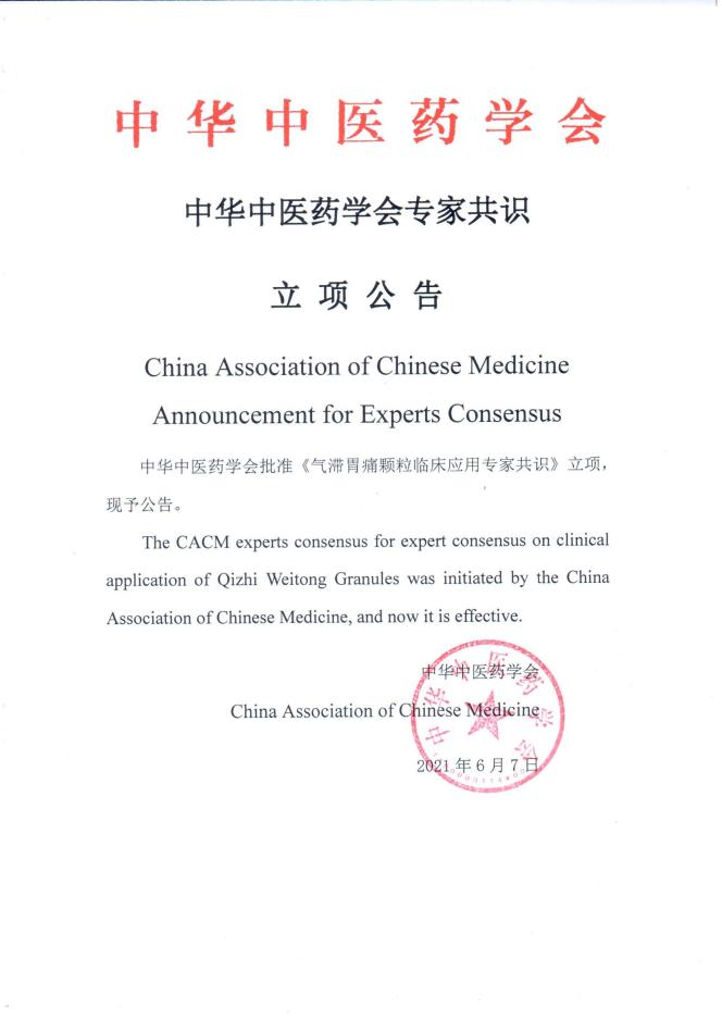 《气滞胃痛颗粒临床应用专家共识》简介气滞胃痛颗粒是1983年中华中医药学会内科分会脾胃学组数十位专家共同确立的协定处方,为全国医保甲类目录品种(2009年版-2020年版),被纳入《国家基本药物目录》(2018年版)、《中华人民共和国药典》(2005年版—2020年版),同时也被多个消化疾病的中医诊疗指南或共识列为推荐用药。气滞胃痛颗粒由柴胡、延胡索(炙)、枳壳、香附(炙)、白芍、甘草(炙)六味药组成,组方合理,配伍得当,具有疏肝理气,和胃止痛之功,广泛用于肝郁气滞,胸痞胀满,胃脘疼痛等上消化道疾病的治疗,具有良好的临床疗效和安全性。