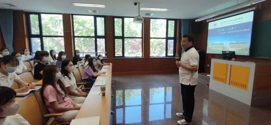 2021年6月4日,北京市第二中学经开区学校钮小桦校长对全体青年教师进行了第一次全员培训,详细解读了“文化立校、文化育人”的学校文化内涵。钮小桦校长从办学理念和学校发展总目标入手,向教师们讲解了学校校训、校徽及校服的含义,并系统地梳理了学校仪式文化、学校管理文化、学校制度文化、师生行为文化以及课程与教学文化。钮校长要求每一位教职工要明确工作要求,抓住学生品质培养着力点,以人为本,全员行动,营造文化育人氛围。