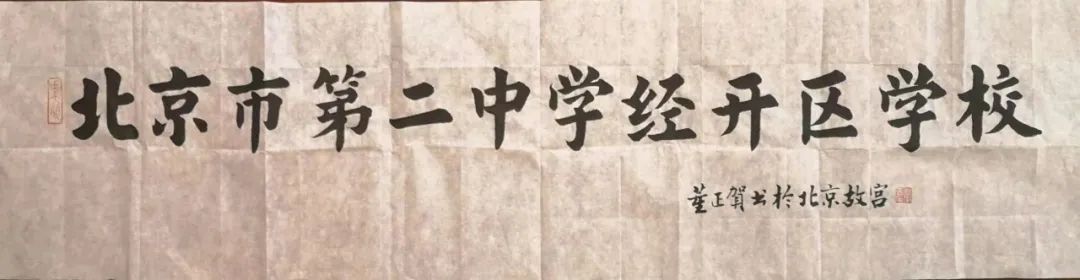 北京市第二中学经开区学校的校名由故宫博物院著名书法家董正贺题写。校徽