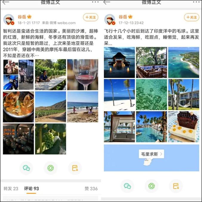 微博图在被网友“扒皮”后,谷岳迅速删掉了8日的微博。中国自不用说,美国、智利、印度、日本、毛里求斯……一路走一路换着花样吃。谷岳看过了许多美景,也尝过了许多美食。