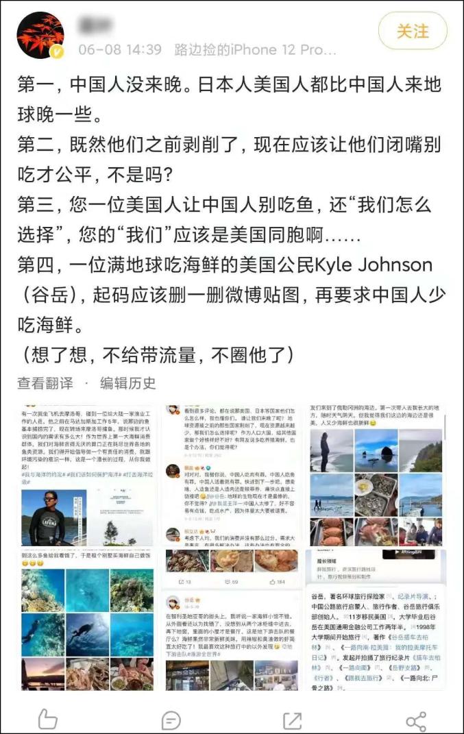 还有许多图,受限篇幅只放这么多8日下午,一位微博知名科技大V发微博驳斥谷岳的回应称,既然他们(西方人)之前剥削了,现在应该让他们闭嘴别吃才公平,不是吗?他还喊话“您一位美国人让中国人别吃鱼,还‘我们怎么选择’,您的‘我们’应该是美国同胞啊……”最后他提醒谷岳,起码应该删一删微博贴图,再要求中国人少吃。