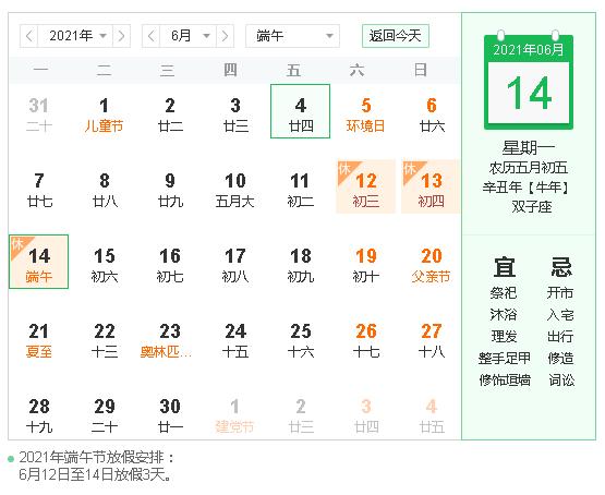 根据国务院办公厅通知,2021年端午节放假安排通知如下:6月12日~6月14日放假,共3天。