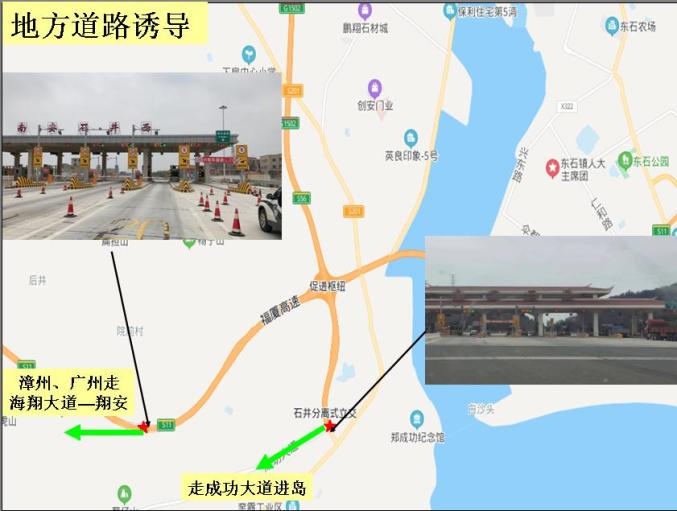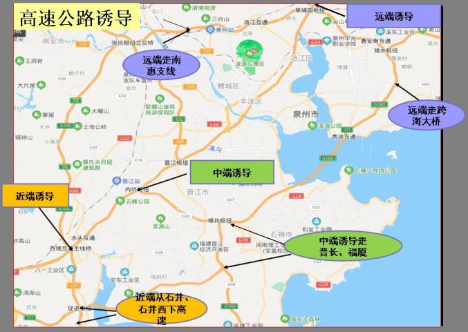 二、泉南高速观音山-保福岭:上行路段--南惠支线惠安南往南安方向的车流从泉州北下高速、绕行国省道至南安北上高速;南惠支线南安往惠安南方向的车流从南安下高速,绕行国省道至南安北上高速;泉南高速泉州往三明方向的车流从泉州西、泉州南下高速,绕行国省道至南安北上高速。下行路段--泉南高速三明往泉州方向车流从南安北高速入口下高速,绕行国省道至泉南高速泉州西入口上高速。三、泉南高速永春互通-龙阁岭隧道:上行路段--泉南高速泉州往三明方向的车辆从永春下高速,绕行国省道至永春蓬壶入口上高速。下行路段--泉南高速三明往泉州方向车流从蓬壶下高速绕行国省道至泉南高速永春高速入口上高速。