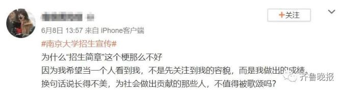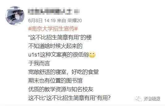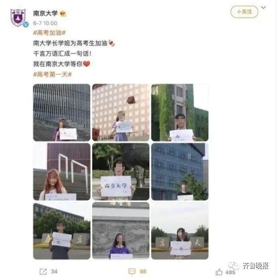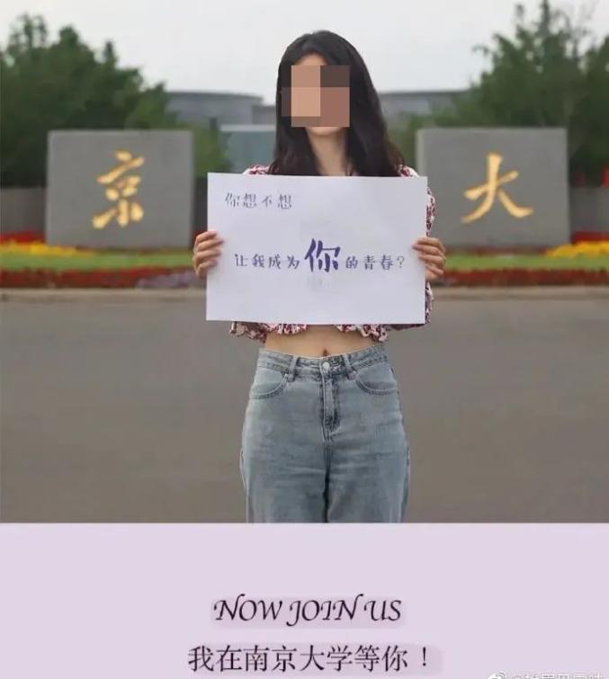 6月7日,@南京大学 发了一条微博宣传文案,内容为:“南大学长学姐为高考生加油,千言万语汇成一句话!我在南京大学等你。”文案下配上了九张学长、学姐的话。引发争议最大的就是