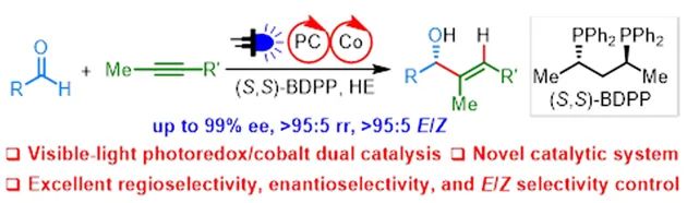 国科大博士生导师、中科院兰州化学物理研究所羰基合成与选择氧化国家重点实验室夏纪宝研究员团队首次实现可见光/钴协同催化的炔-醛不对称还原偶联反应。相关成果在线发表在J. Am. Chem. Soc.上,文章第一作者为国科大博士研究生李彦霖(培养单位:中科院兰州化物所)。