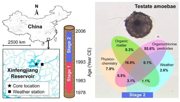 /在水库有壳虫群落对自然和人为干扰的响应方面获进展国科大博士生导师、中科院城市环境研究所水生态健康研究组杨军研究员团队和中科院广州地球化学研究所张干团队等研究者对过去近30年的生态环境变化开展研究,共鉴定有壳虫7属27种,砂壳虫最为优势。有壳虫物种数、丰度和生物量变化范围分别为:18–26种、616–825ind/mL、9.0–19.4μg C/mL。通过有壳虫群落变化反映出新丰江水库经历了两个演变阶段:第一阶段,有壳虫群落与沉积物干容重、碳氮比、p,p'-DDE,以及氮、硫元素密切相关;第二阶段,有壳虫群落主要受到沉积物干容重降低,铝、铁和碳元素的升高,低碳氮比和低有机氯农药,降水波动变化等因素的影响。其中有壳虫群落演变的阶段性特征与来自水库流域内外的人为有机氯农药在大气中的沉降、流域内营养盐输入等沉积记录相一致。