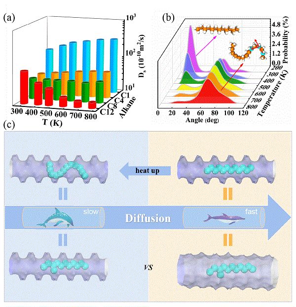 /在沸石分子筛扩散领域研究方面取得进展近日,国科大研究生导师、中科院精密测量院郑安民研究团队在沸石分子筛扩散领域取得新进展。相关研究成果发表在国际期刊PNAS上。“热阻”通常指的是物体对热量传导的阻碍效果。该工作将“热阻”概念引入到传质过程中,发现“热阻效应”引起分子筛反常的扩散需要满足以下两个条件:首先,吸附分子需要有一定的长度和柔性,其分子链长和弯曲程度随温度呈现明显变化;其次,该类反常扩散现象需要特定的限域环境。该团队结合多尺度理论模拟和实验研究发现分子筛限域孔道中存在反常的“热阻效应”。国科大博士研究生袁家敏(培养单位:中科院精密测量院)为论文的第一作者,郑安民和特别研究助理/博士后刘志强为论文通讯作者。