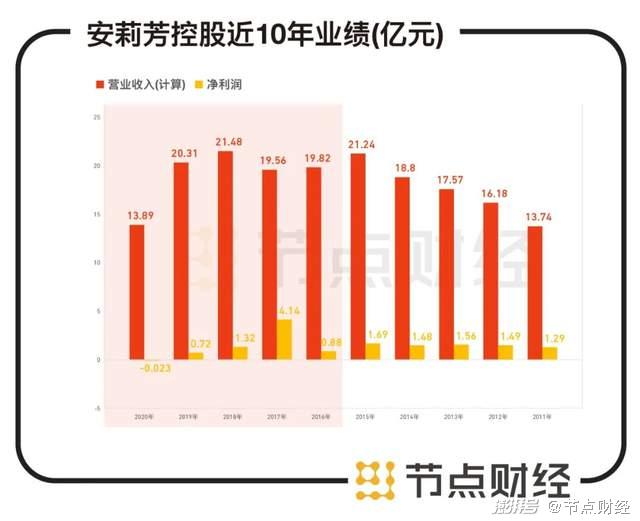 同样在2016年前后,安莉芳和汇洁股份遇到的问题差不多,其业绩都是在2016年开始了滑坡,最老牌的安莉芳一蹶不振不仅赚不了什么钱,到了2020年“中国内衣之父”开始亏本,而且市场表现和一支老仙股没什么两样…