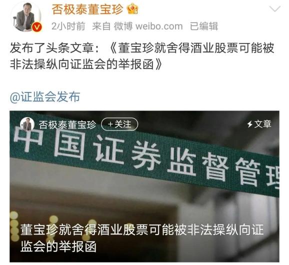 董宝珍举报舍得被操纵6月9日晚间,知名大V董宝珍发布微博,他对过去一年涨了将近十倍的股票,一季报仍有5.3万投资者的“舍得酒业”进行了举报。他说:“我就舍得酒业股票可能被非法操纵向证监会进行举报。”