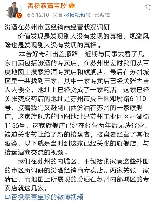 就在上述微博发布不久,董宝珍还发布了他对“汾酒在苏州市区经销商经营状况”的调研结果,并配有调研视频。