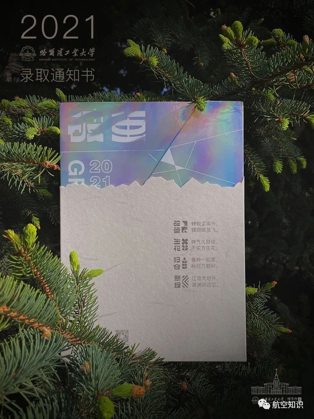 2021年哈工大录取通知书的主视觉运用了镭射材质的呈现特点。这种材质表面不发光,但在光的照射下,每一个角度都会呈现出不同的色彩。代表着只要有舞台,哈工大人就能绽放出炫目的光芒。此次录取通知书设计概念从“分享”的主题出发,分为四个章节:破茧、生花、归仓、新程。希望经历过高考大关的学子们,缓下脚步略作停留,以哈工大之名向出现在生命里、所有辛勤付出的人们表达感谢之情。