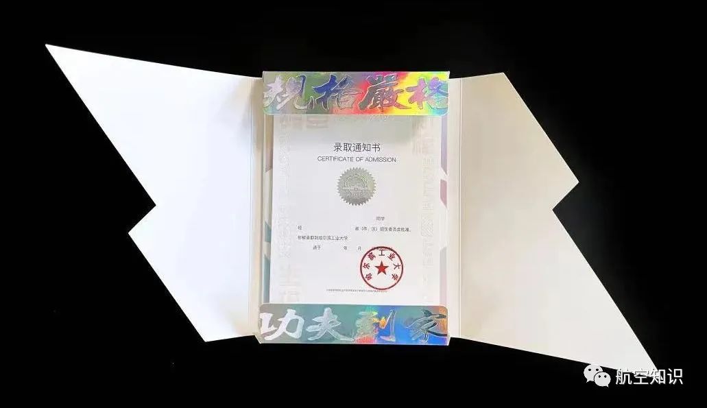西工大的四字校训:“公、诚、勇、毅”,激励了无数工大学子奋勇向前;录取通知书中间为学校特色建筑,由大飞机、亚洲最大水上图书馆和长安校区正门构成的组图,展现了校园的硬件设施和风光;底部为陕西特色传统建筑和新式建筑的结合,秦岭山脉和云朵贯穿其间,体现传统与现代相结合,寓意着西北工业大学扎根西部,服务地方经济社会发展,奋力谱写陕西新时代追赶超越新篇章。南京航空航天大学