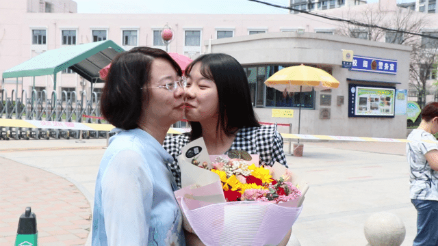 程莞茵一走出考场,妈妈便给她送上了鲜花和拥抱,母女俩亲密相拥。