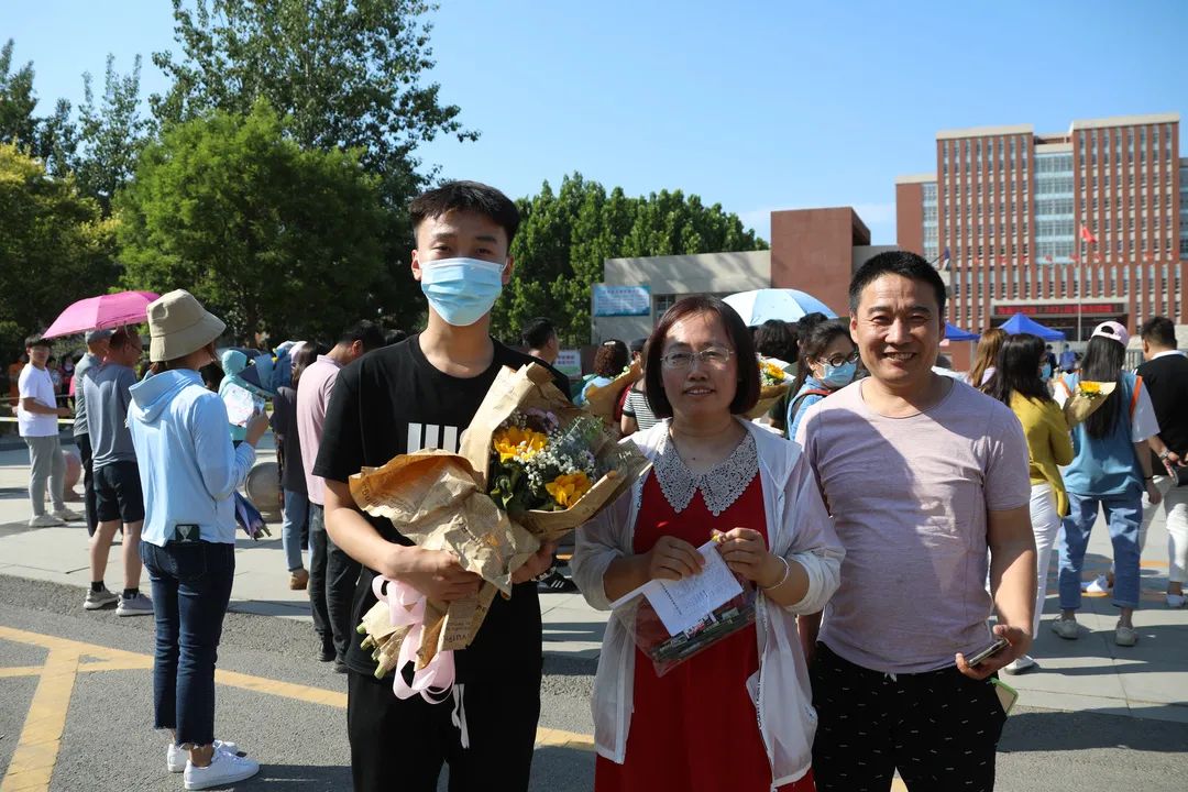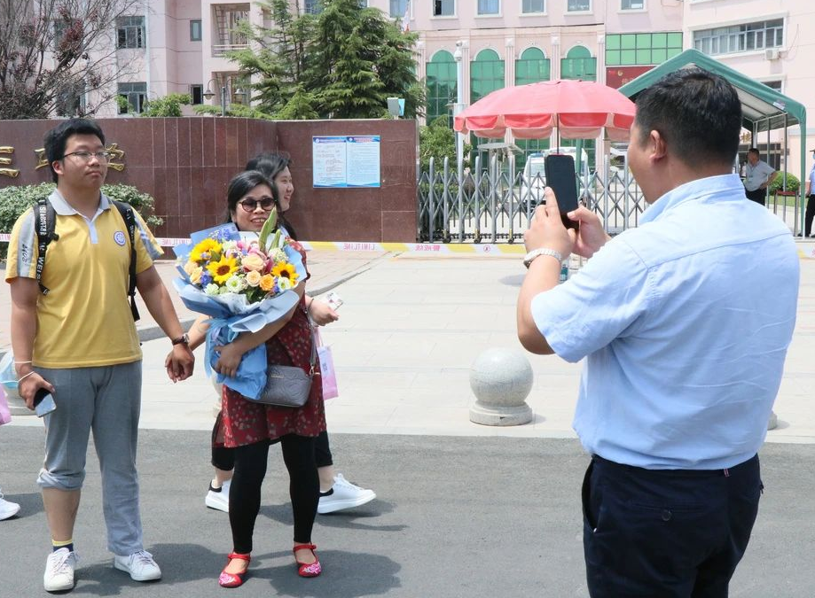 考场外,许多家长手捧向日葵
