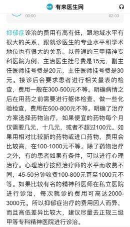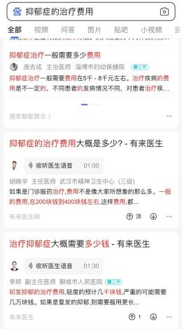 治疗费用高昂,是大多数抑郁症患者不愿接受系统治疗的重要原因。抑郁症治疗的费用包括药物和心理治疗的费用,地域不同、医院资质不一、医生的水平差异、患者患病程度不同等因素都影响着费用的高低。在百度上搜索抑郁症的治疗费用,全国各地不同医院的医师回答各不相同。