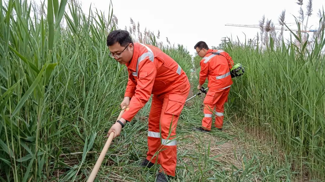 “芦苇荡,美如画”,挥舞镰刀的身影和被阳光晒红的脸庞是潍坊处管道保护工清理巡护通道的样子。清理标准是“路见土、沟见底、通道见本色”,不给盗油分子可趁之机。开展管道周边房屋场院排查管控