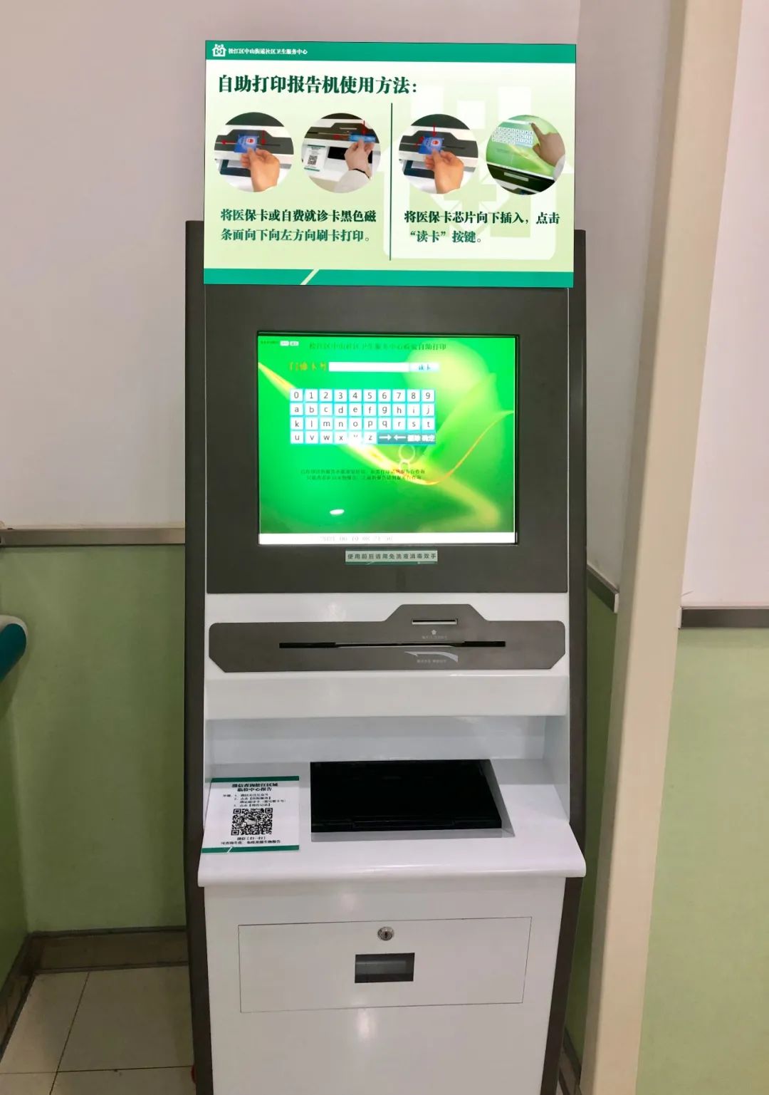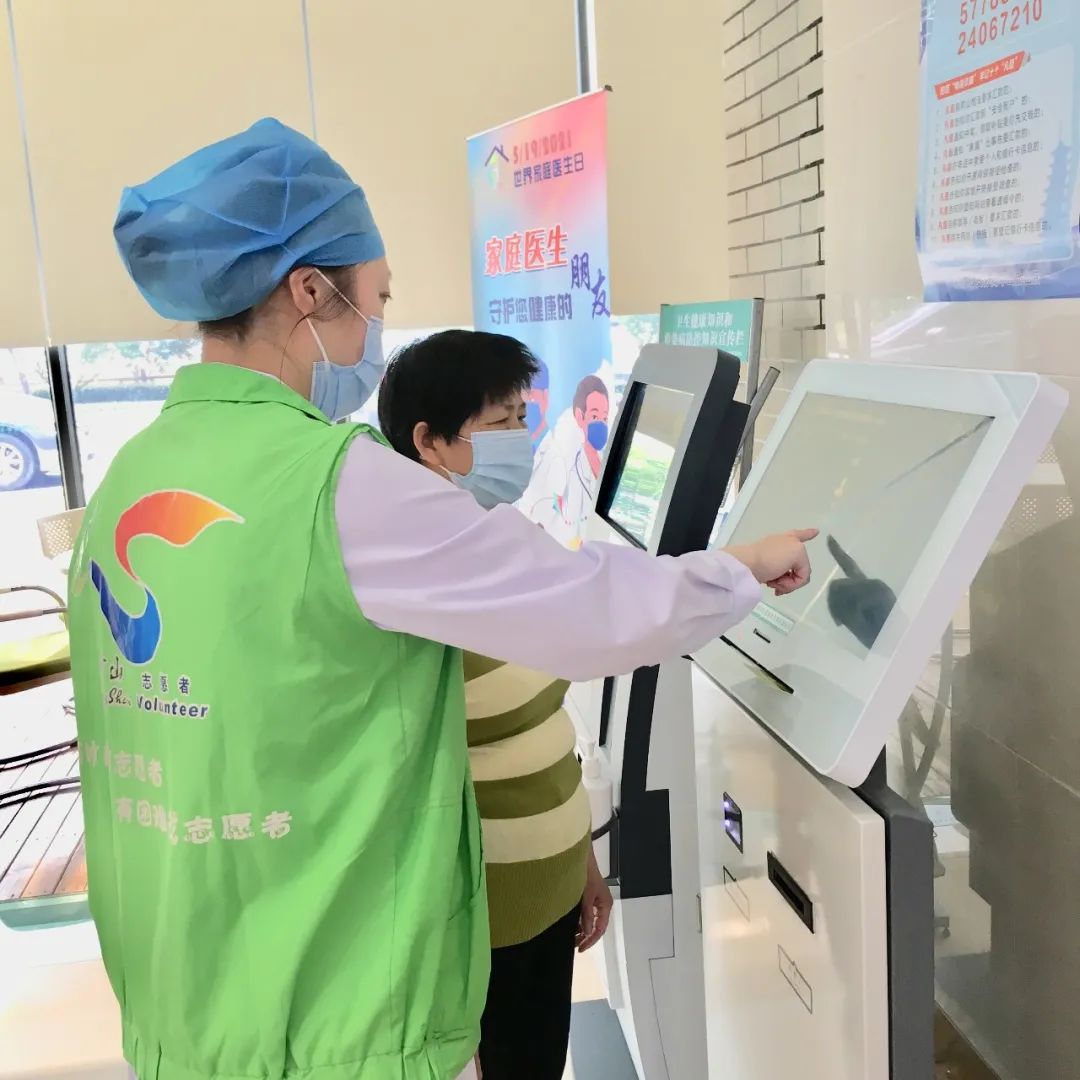 中心内的自助服务机上方都制作了大号字体、颜色清晰的引导标识。每年一次的老年人体检,都会有专门的志愿者为老年人提供志愿服务。