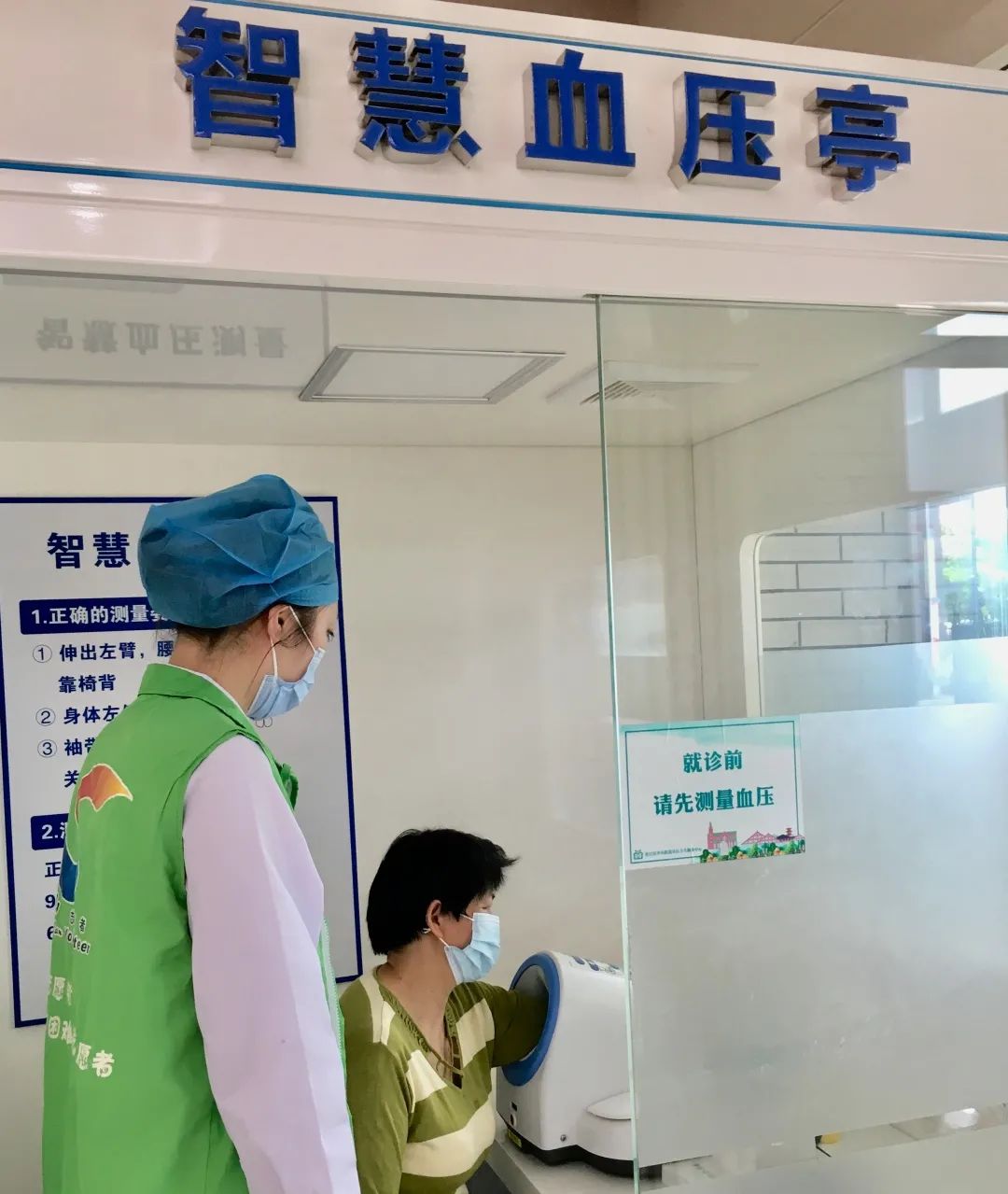 进入门诊大厅,预检台有为老年患者提供的轮椅、老花镜等便民服务设施,可随时使用,还有自助挂号机器、智慧血压亭等都可为老年患者提供便民服务。