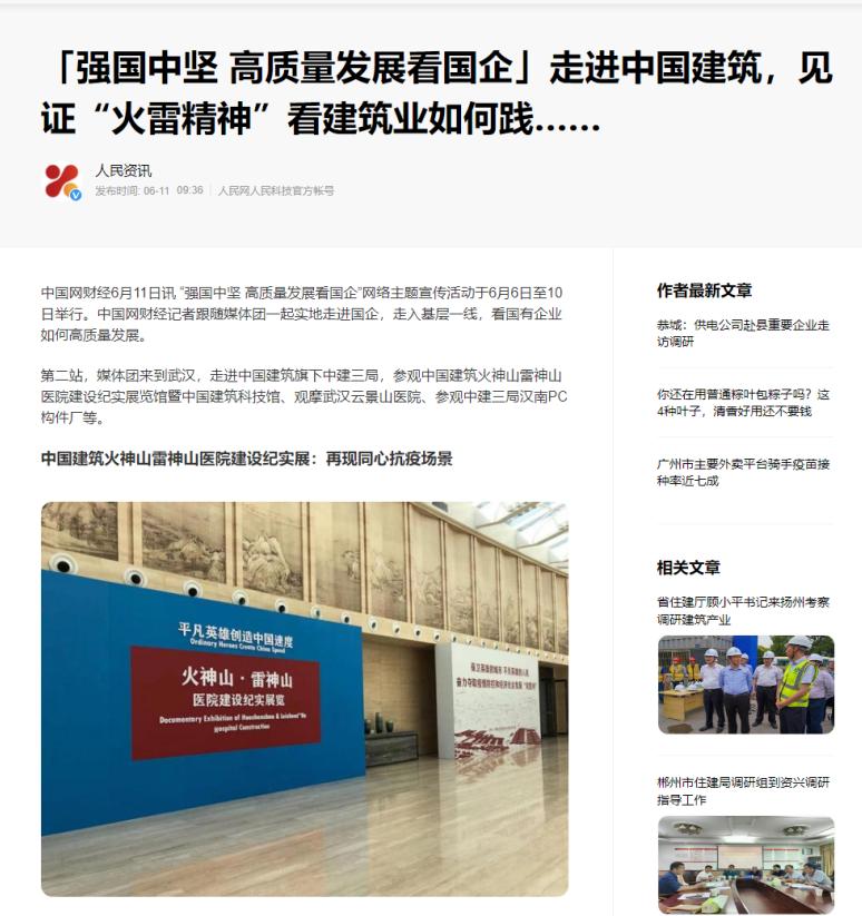 6月7日-8日,“百年党旗红 国企新征程”暨“强国中坚 高质量发展看国企”网络主题宣传活动和中建集团“建证百年 同心筑梦”开放日第9、10、11场之“初心筑魂 传承红色基因”,在中建集团旗下中建三局(投资)建设(运营)的中国建筑火神山雷神山建设纪实展览馆暨中国建筑科技馆、武汉云景山医院项目、中建三局汉南PC构件厂举办。本次活动由中央网信办指导,国务院国资委新闻中心联合中建集团主办,邀请央视网等20余家知名网络媒体参观打卡,并采访“火雷兄弟”、“火雷宝宝”家庭、志愿代表等。