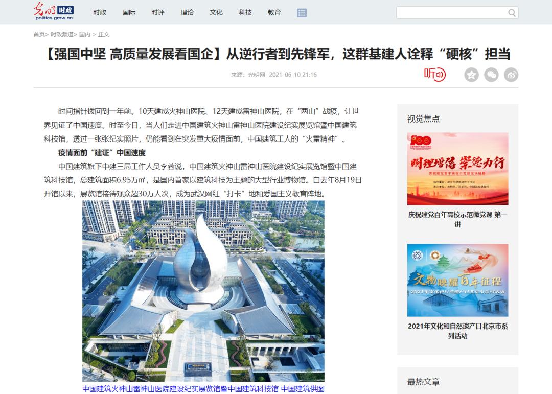 在武汉,由中建三局投资建设运营的中国建筑火神山雷神山医院建设纪实展览馆暨中国建筑科技馆,总建筑面积6.95万平方米,是国内首家以建筑科技为主题的大型行业博物馆。