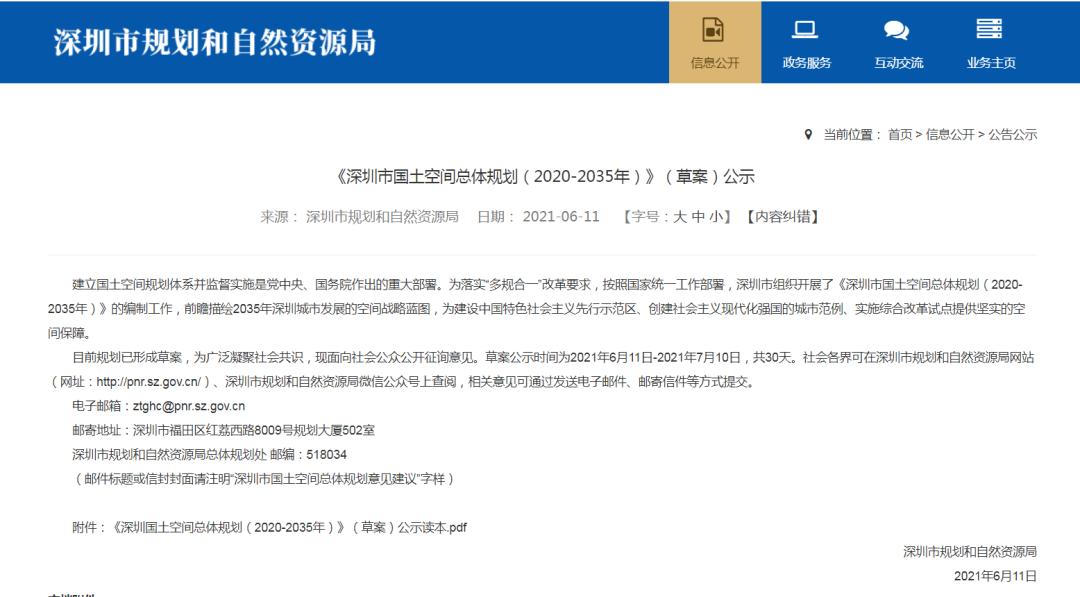 《深圳市国土空间总体规划(2020-2035年)》(草案)公示时间为2021年6月11日-2021年7月10日,共30天,社会各界可在市规划和自然资源局网站和微信公众号上查阅,并可通过发送电子邮件、邮寄信件反馈意见建议。从6月25日开始,市规划和自然资源局将在城市规划展览馆、十个区进行现场展览,开展线下公示活动。此外,市规划和自然资源局将于7月10日在城市规划展览馆举办一场公众论坛,邀请城市规划相关行业人员和社会公众进行现场互动交流。