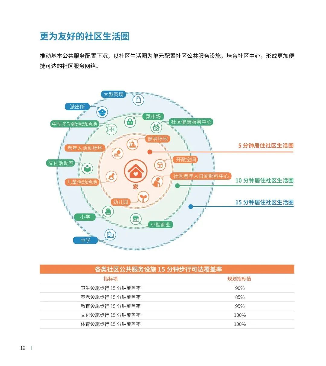 更为友好的社区生活圈——推动基本公共服务配置下沉,以社区生活圈为单元配置社区公共服务设施,培育社区中心,形成更加便捷可达的社区服务网络。