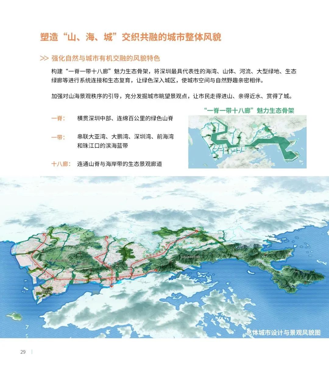11、构建“一脊一带十八廊”魅力生态骨架将深圳最具代表性的海湾、山体、河流、大型绿地、生态 绿廊等进行系统连接和生态复育,让绿色深入城区,使城市空间与自然野趣亲密相伴。