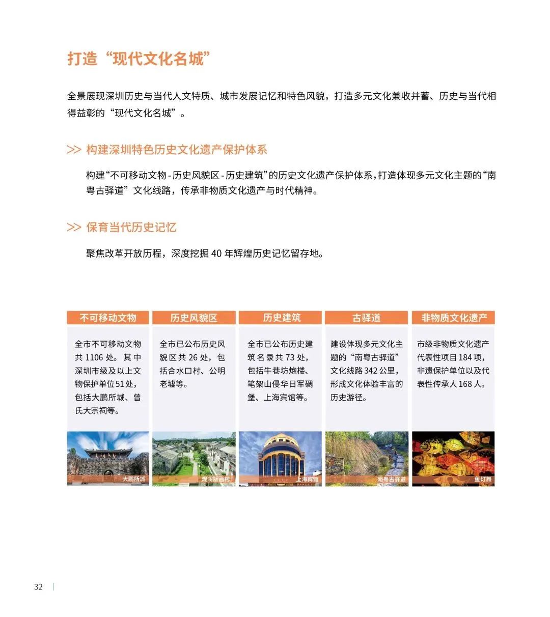 12、构建深圳特色历史文化遗产保护体系构建“不可移动文物一历史风貌区一历史建筑”的历史文化遗产保护体系,打造体现多元文化主题的“南粤古驿道”文化线路,传承非物质文化遗产与时代精神。