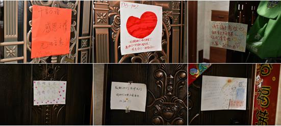 居民在门前贴着手绘抗疫图画和“感恩”“加油”的字条当然还有来自社区的认可,我们服务到观御、融穗等4个社区,每个社区领导都发自内心给了广汽集团战疫先锋队很高的评价,“专业务实”是大家提到最多的赞语。刚到观御社区时,街道同事直接对我讲,“不想用志愿者,干起活来不专业还拈轻怕重”。在当天动员会上,我就用这句话来激励队员。那一天,我们身着防护服奋战10余小时,队员不敢喝水,都没上厕所。当天晚上,街道同事就专门发微信给我,专门表扬广汽集团战疫先锋队“特别优秀,肯干务实工作到位!”