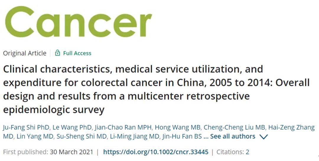 [2]Ju-Fang Shi,Le Wang,Jian-Chao Ran,et al.Clinical characteristics,medical service utilization,and expenditure for colorectal cancer in China,2005 to 2014:Overall design and results from a multicenter retrospective epidemiologic survey.cancer.2021 Jun 01;127(11).https://doi.org/10.1002/cncr.33445.