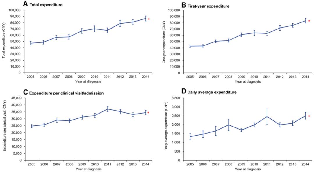 另外,从2005年到2014年的10年间,每位患者的医疗支出迅速增加,这表明我国与CRC相关的经济负担正在上升。