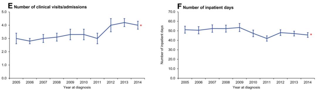 此外,单次就诊的临床支出(图2C)、平均每天的医疗花费(图2D)和临床就诊次数(图2E)都发生了增长。
