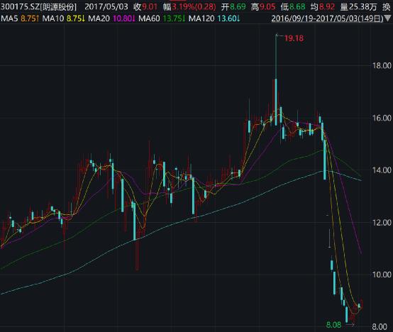 我们来看看在此期间朗源股份的股价走势,可谓是大起大落,最高一度涨至19.18元,2017年4月出现断崖式下跌,一度跌至8.08元。到现在,该股最新股价仅为4.4元,总市值仅21亿元。