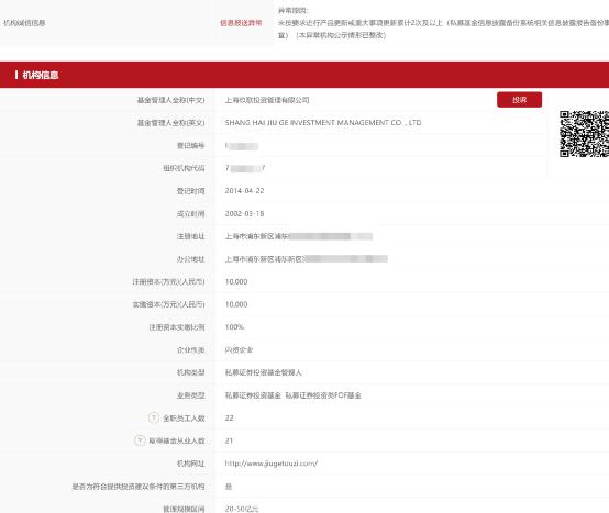 我们来看看上海玖歌投资的情况,资料显示,该公司成立于2002年3月,注册资本1亿元,是国内最早成立、存续时间最长的私募基金公司之一,2014年4月在基金业协会完成私募管理人登记,目前管理规模在20-50亿元,全职员工22名。