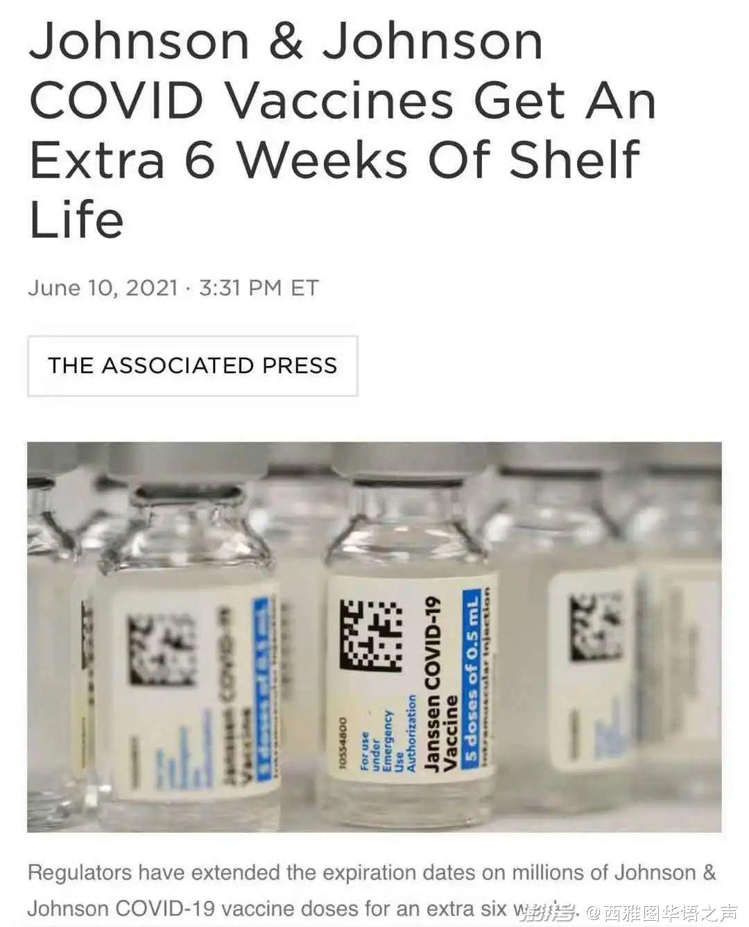 【综合讯】据报道,强生公司10日表示,美国食品和药物管理局(FDA)将其新冠疫苗的有效期延长了六周,美国药监局是在州官员警告说许多未使用的强生疫苗将在本月底前到期之后发布这一公告的。此举被认为有助于缓解对于数百万剂即将到期的强生疫苗的担忧。美国药监局10日表示,强生疫苗的保质期从原先的3个月改为4个半月。