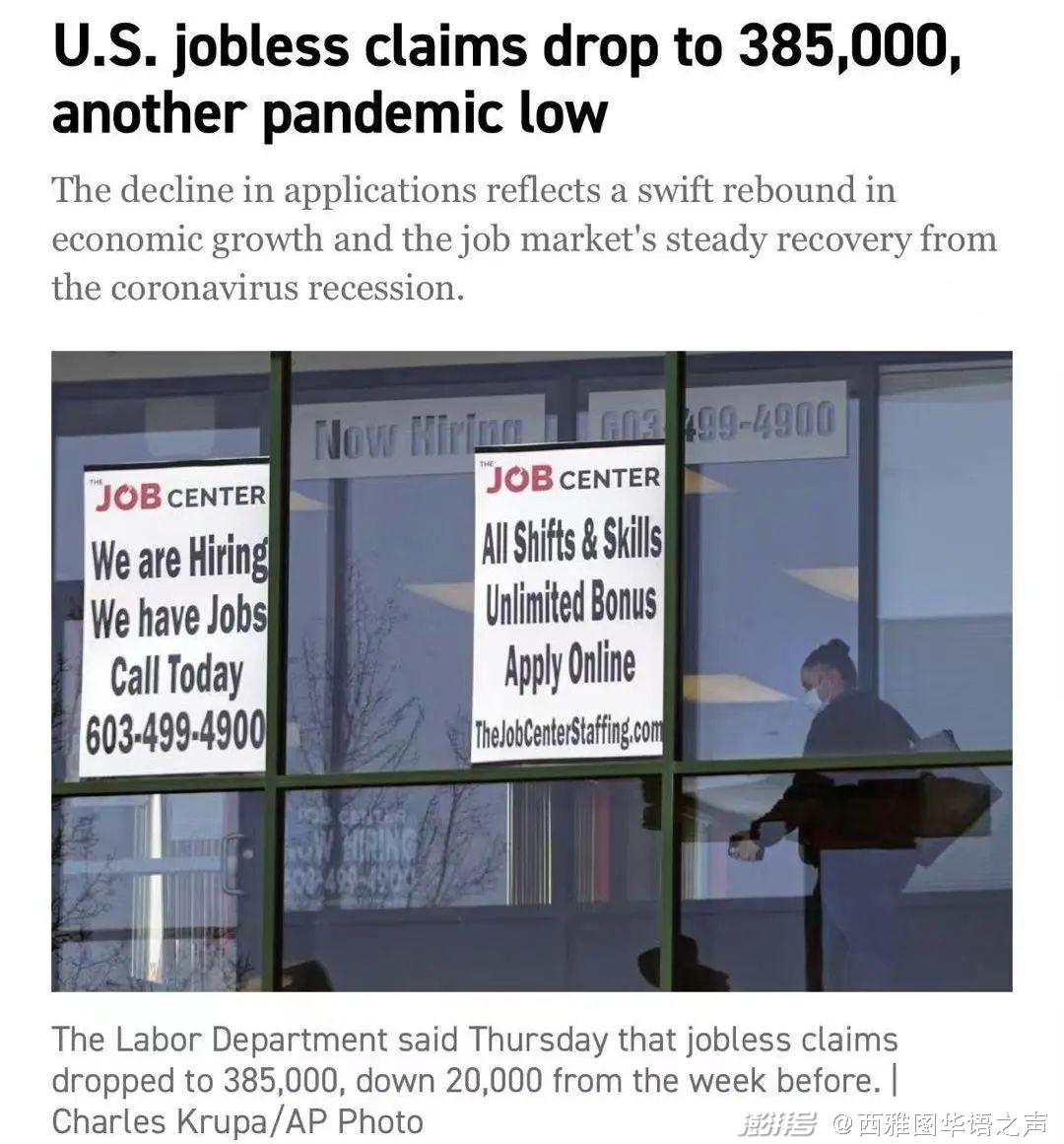 劳工部6月10日公布的数据显示,上周首次申请失业救济人数下滑至疫情以来的新低。据悉,上周首次申请失业救济人数从此前一周的38.5万下滑至37.6万,是去年春天疫情爆发以来的最低水平。疫情之前每周申请失业救济人数约为20万,因此当前距离疫情前水平仍有一定差距。