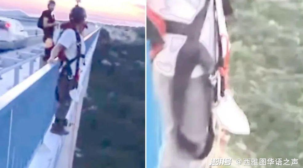 【综合讯】近日,一名男子和朋友在一座桥上玩定点跳伞,他站在桥的边缘准备跳下,突然一名路人走过去给他说让他回来,安全带没有系好。