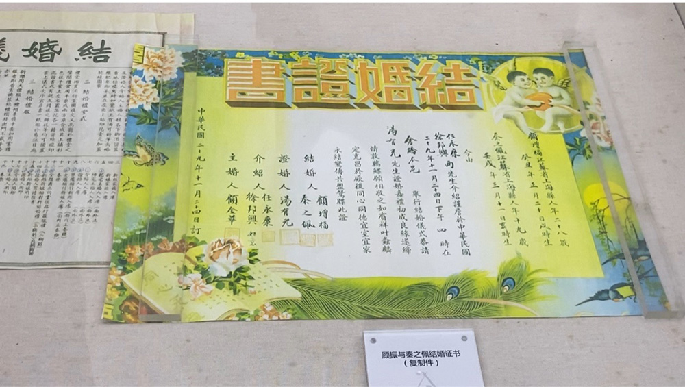 顾振烈士纪念馆内展出顾振与秦之佩结婚证书的复制件。澎湃新闻记者 俞凯 图