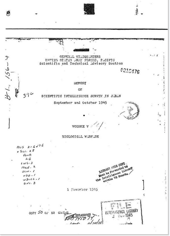 据美国国家档案馆文献记载,早在二战结束前,美军便已获悉日军在中国进行细菌战的事实,并在1945年到1947年期间,前后五次派遣科研队伍调查并尝试用各种渠道得知相关实验“成果”——