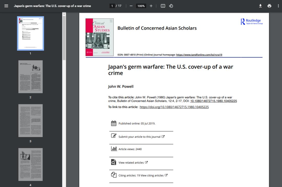 ▲《日本细菌战:美国掩盖战争罪行》报道(部分)。截图自TandfOnline文献平台鲍威尔在文章中提到,1947年7月1日,一份写给美国国会、陆军和海军调整委员会(SWNCC,成立于1944年)的备忘录中提到,“(石井和他的亲信)愿意提供8000张从人类和动物实验中获得的幻灯片……任何‘战争罪’的审判都将向所有国家充分披露这些数据。因此,为了维护美国的国防和国家安全,应该避免。”