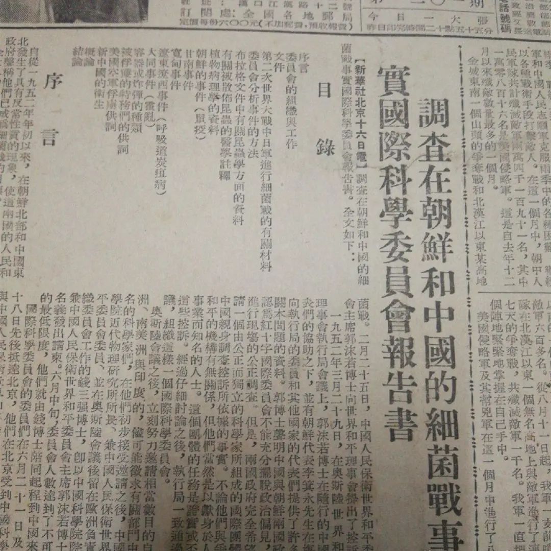 ▲资料图:1952年9月17日《长江日报》刊载的新华社相关报道在世界和平理事会邀请下,由瑞典、法国、英国、意大利、巴西和苏联的著名科学家组成的“调查在朝鲜和中国的细菌战事实国际科学委员会”前往中国东北和朝鲜。