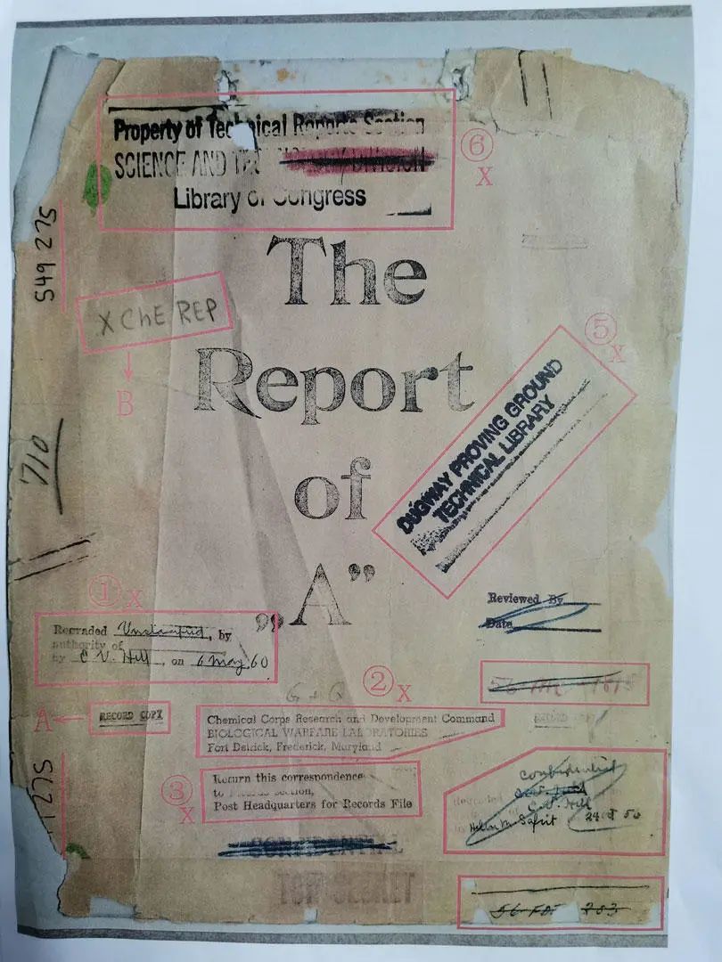 美国媒体相关报道提及,在731部队《炭疽菌实验报告》《鼻疽菌实验报告》《鼠疫菌实验报告》三份人体实验报告封面上,分别写有“马里兰州德特里克堡基地生物战实验室化学部队研究与开发部,此函归还至战后总部档案部”的字样,并盖有“达格威实验基地技术图书馆”的黑色墨印。